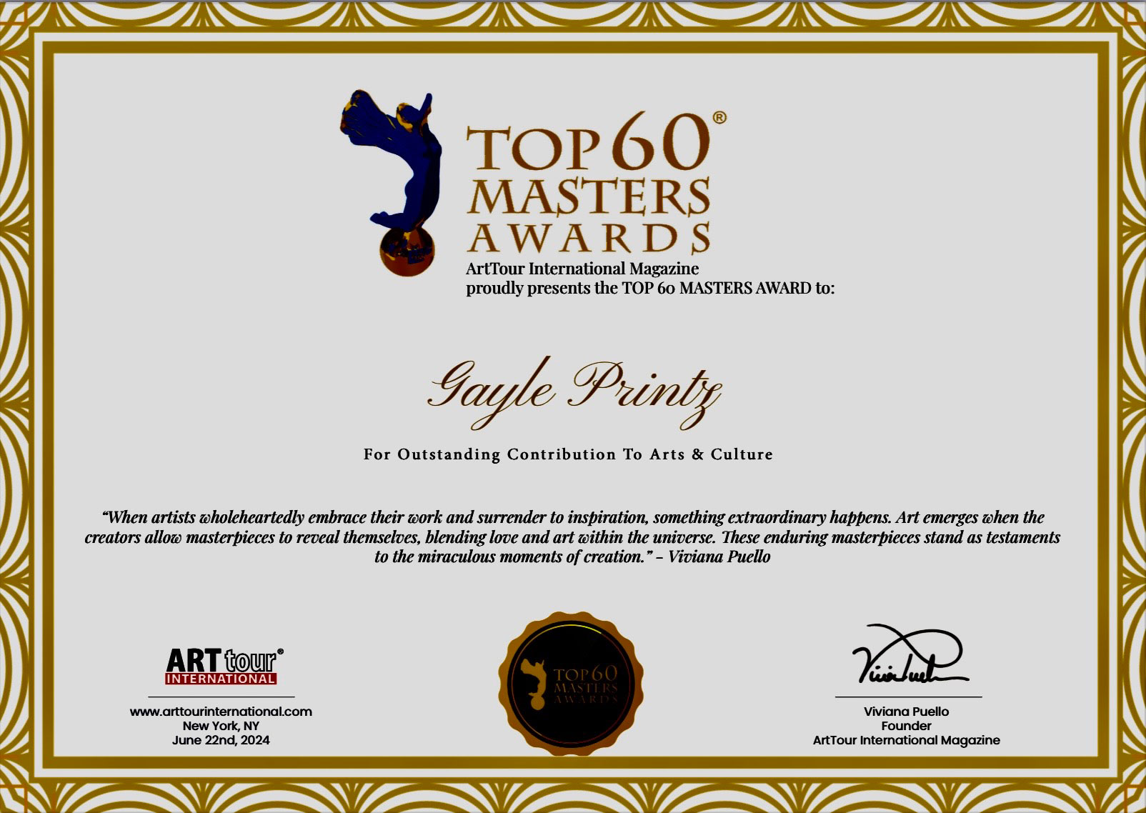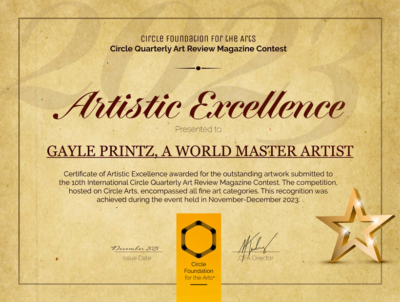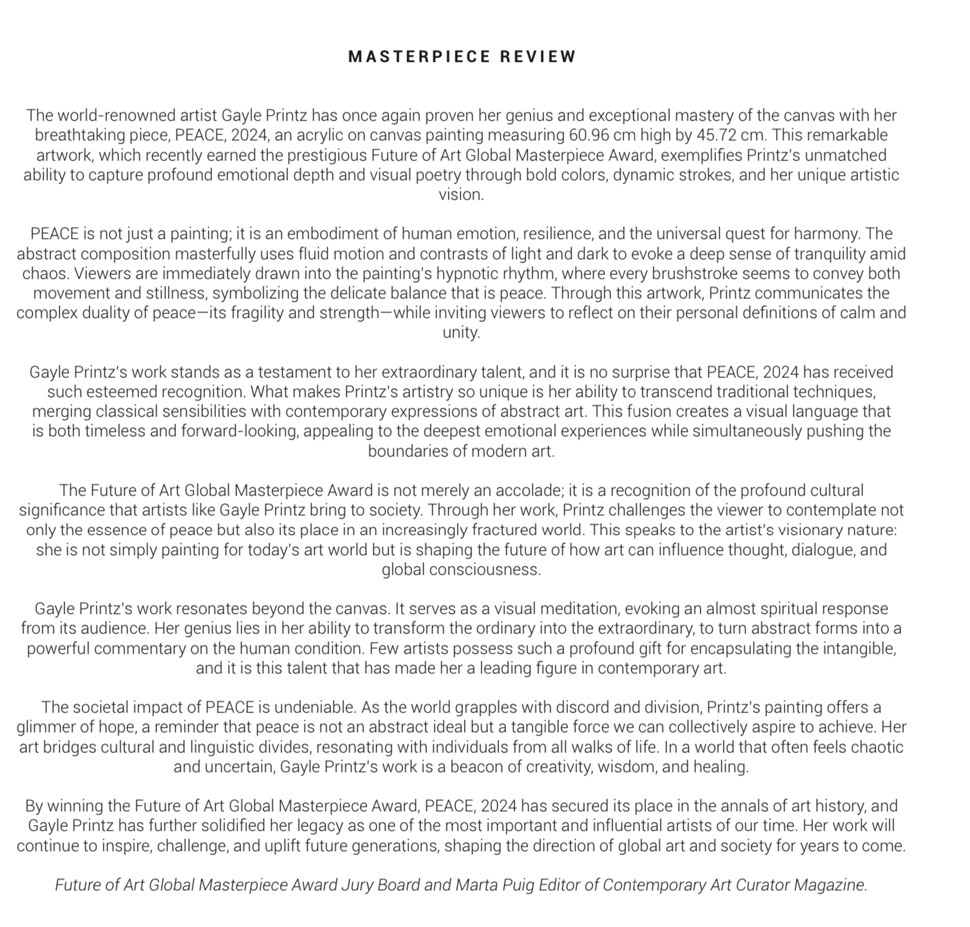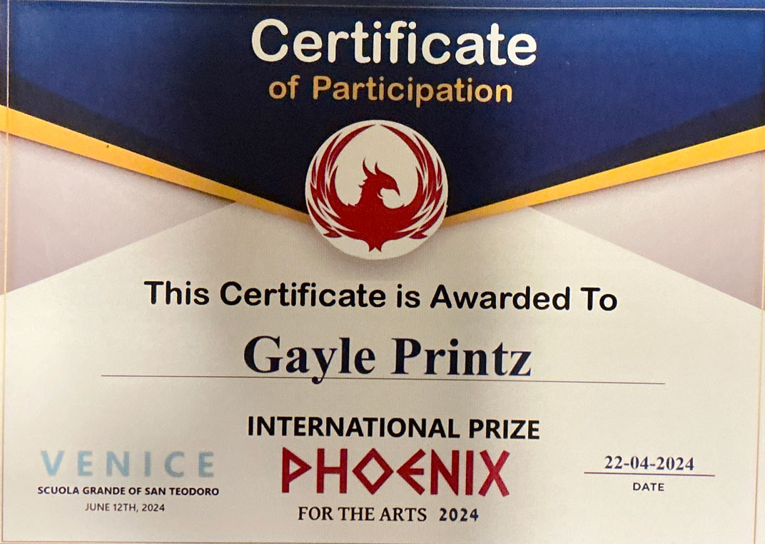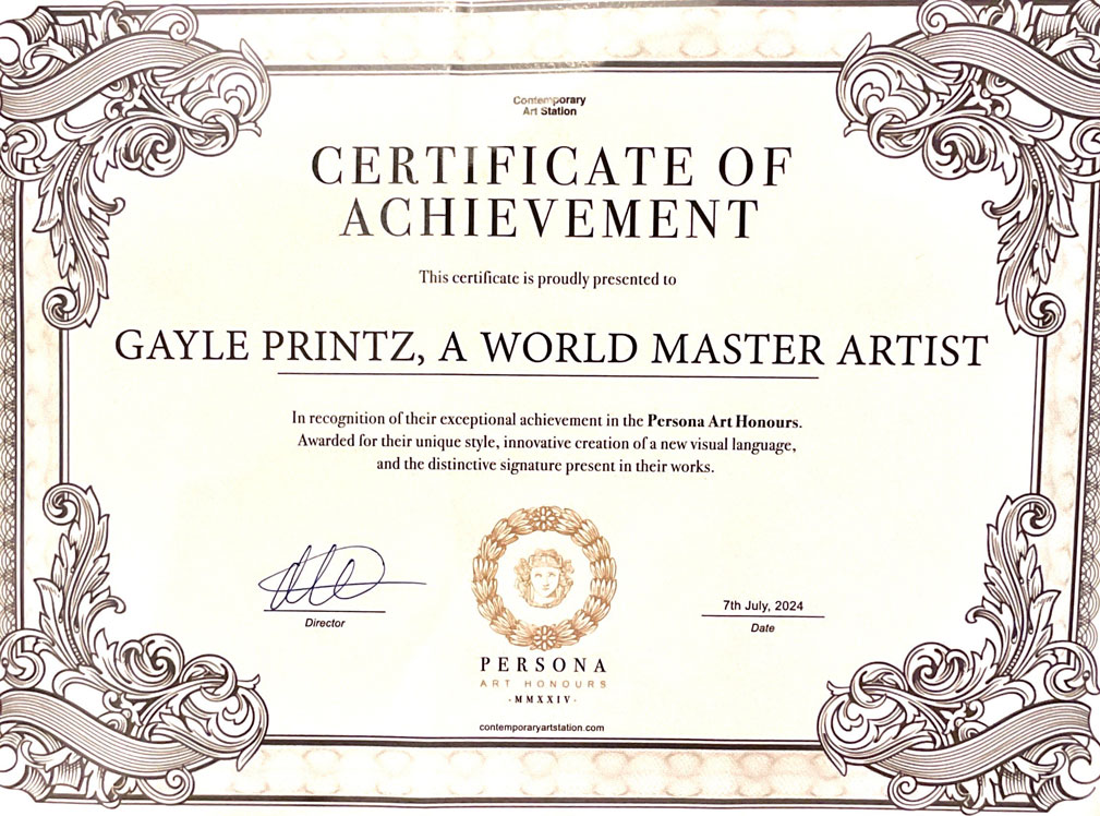 - “GAYLE PRINTZ, A WORLD MASTER ARTIST:” A Professional Art Review by the Jury of THE TOP INVESTABLE ARTIST BOOK OF 2026, Art Market Experts, Hong Kong, Special Administrative Region of the People’s Republic of China