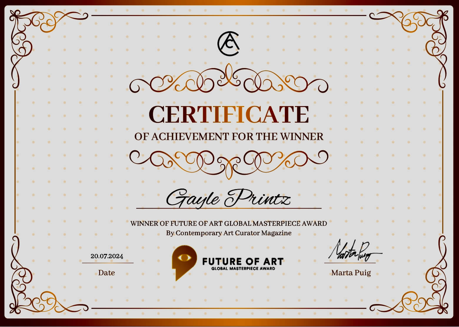 - PUBLICATION: ART LEADERS OF TOMORROW: DEFINING THE FUTURE OF ART, By Marta Puig, Editor-in-Chief of Contemporary Art Curator Magazine Issue 3, Gayle Printz: Pages 32 – 33, Contemporary Art Curator Management, United Kingdom