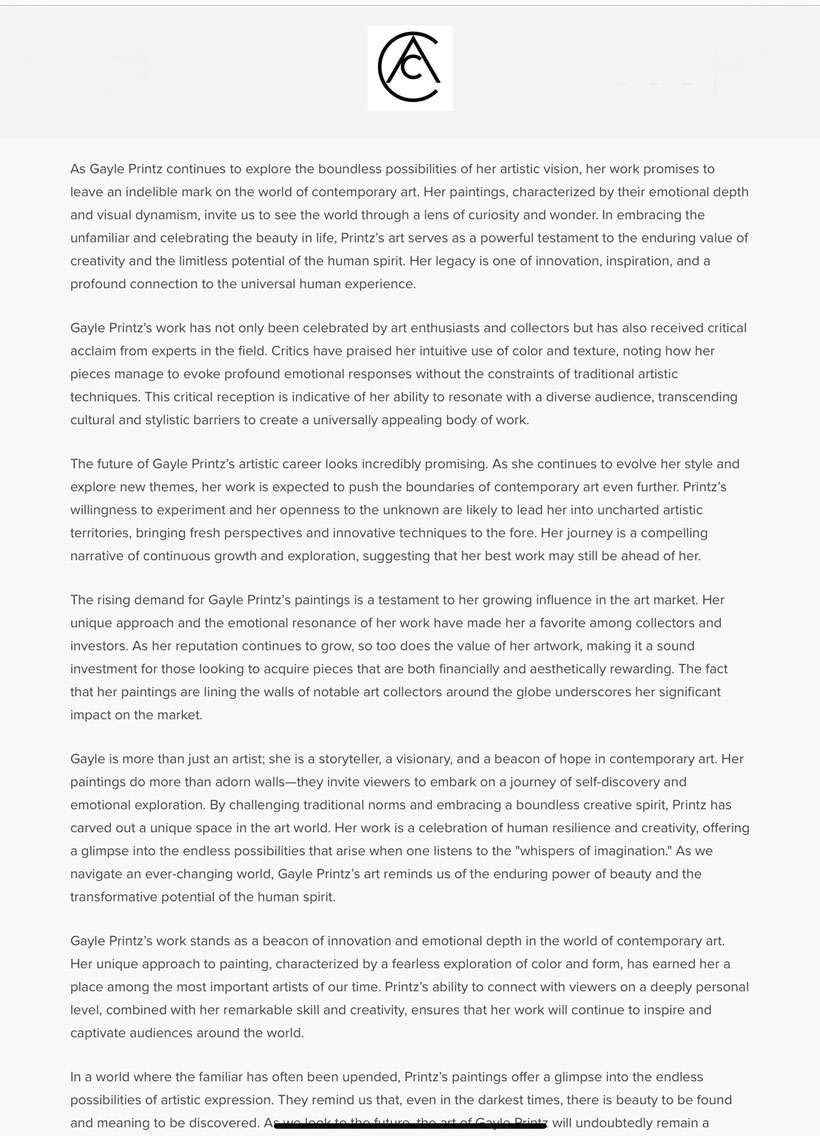- “GAYLE PRINTZ, A WORLD MASTER ARTIST REDEFINING CONTEMPORARY ART THROUGH MODERN ABSTRACTIONISM:” An Interview by The Europe Time