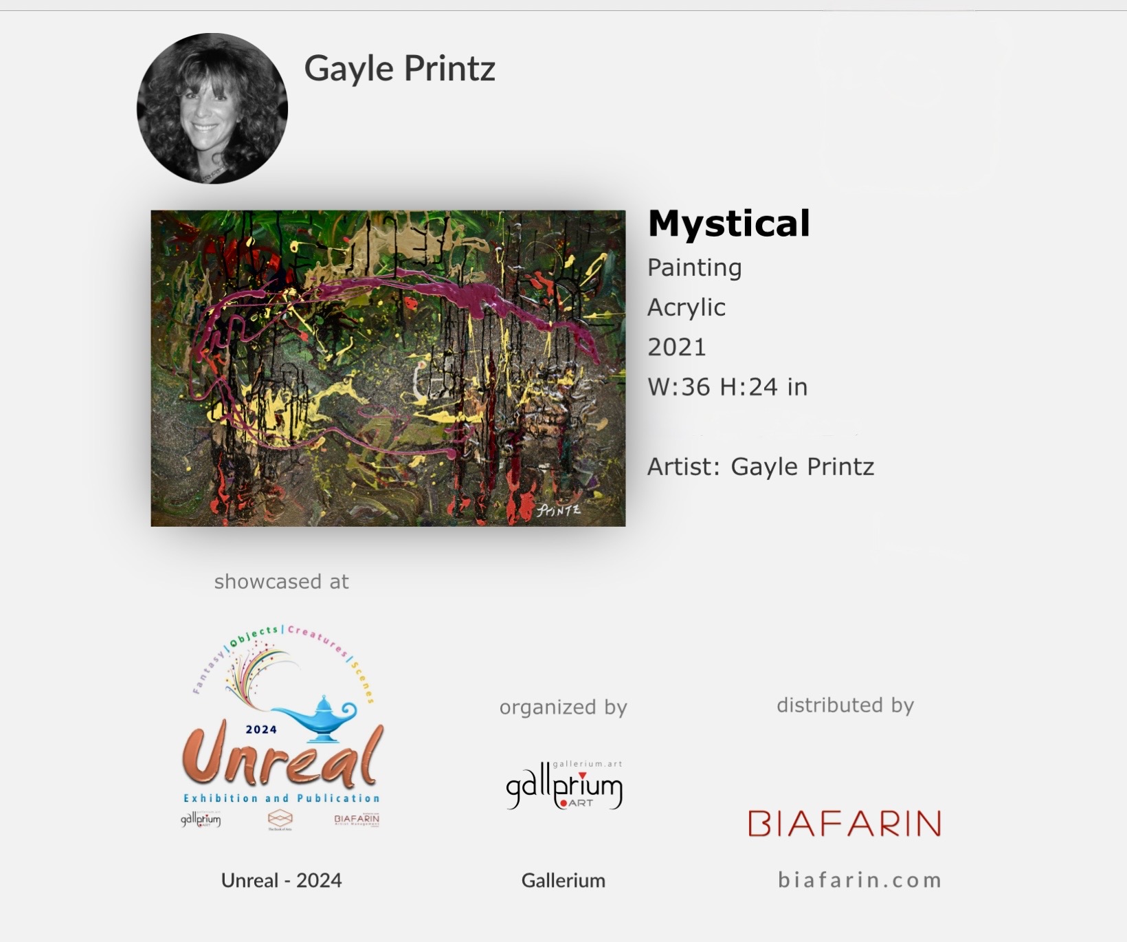 - PROFESSIONAL ART REVIEW: By Despina Tunberg and Myrina Tunberg Georgiou Curators, MASTERFUL MINDS, Issue 8: ARTISTS TO WATCH IN 2025, Page 4, Gayle Printz: COVER ARTIST, Circle Foundation for the Arts, Lyon, France, in Collaboration with World Wide Art Publications, Santa Barbara, California